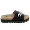 Une mule confortable cuir, pour femme, pour passer un bon Été. Coloris Noir pailleté, métallisé. Un compensé pour le bien des jambes et leurs confort. Semelle liège 1 boucle pour un bon maintien du pied.