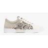Effet vacances,la sneaker hibiscus CASSIE ! On aime le mélange de matière entre le cuir vernis noir, le cuir lisse couleur grès et la toile aux motifs d'hibiscus ou en cuir chèvre métal grès. Sa semelle en gomme bicolore est ultra confortable avec une hauteur de 40mm. Lacet corde bicolore. A porter sans modération avec une jupe courte ou un petit short...
